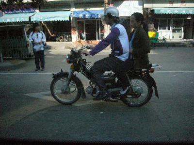 一般的な2ケツです。ご夫婦のようですね。でも街角にはバイクの白タクもいるのでわかりませんが、白タクだと後部の分もヘルメットを持ってましたので、ご夫婦の方が近い気がします。