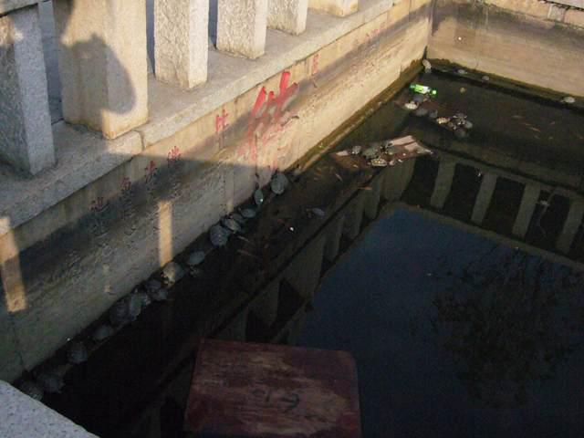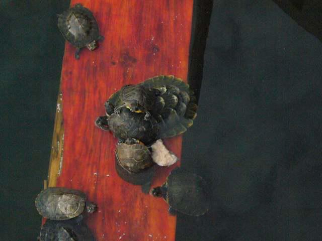 ミドリガメがかなりいました。変ったミドリガメが居て 甲羅が花のようになっています。一番下の大きい奴です。