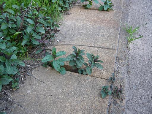 その中のこのクールミント君(写真一番上)が側溝の間から光に向かって背を伸ばして顔だし、おまけに右下に写っているものは