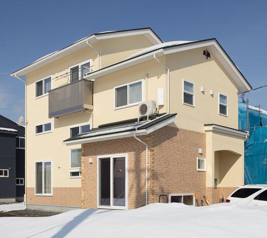 クリーム色の塗り壁調の外壁とレンガ調のツートンの外壁と、