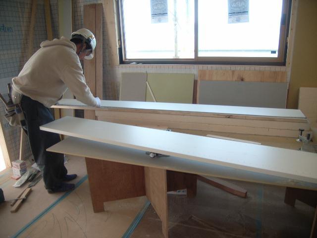 震災の影響で、まだ納入されていない材料等があるようですが、できるところから造作工事を行っております。