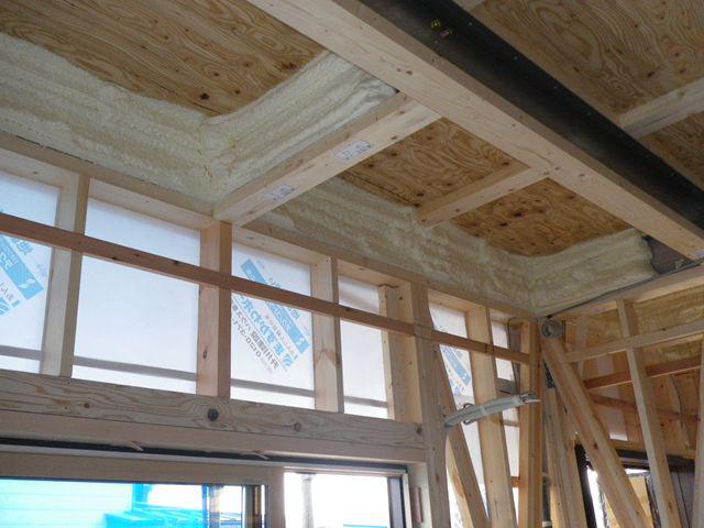 テクノストラクチャー梁材の内側にも発泡ウレタン吹き付けをしっかり行っております。