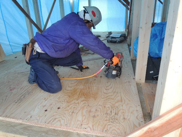 2階の筋交い入れ、サッシ開口の施工が完成し、本日は、1階の床合板下地の施工をおこなっております。