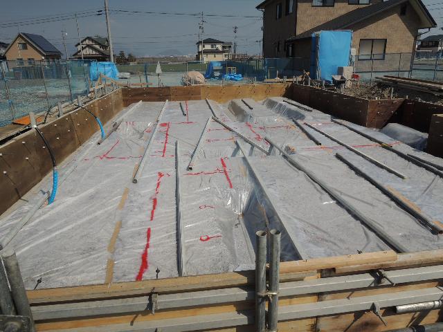 基礎工事は順調に進んでおり、外周部の型枠組立、土間の防湿シート敷きまで完了しました。明日は予定を早めて鉄筋やさんが乗り込みます!