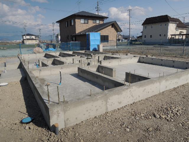 基礎工事が終了し、23日(火)に土台敷きをおこなう為、本日、大工さんと土台の墨出し作業をおこないました。