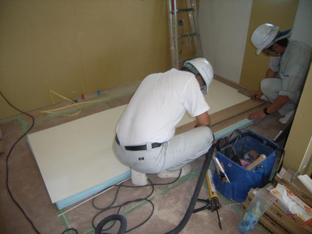 朝一で納まりの打合せをおこない、壁のキッチンボードわ貼るところから作業開始です。