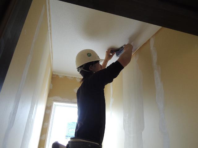 クロスやさん下地処理が終了し、クロス貼り作業に入りました。
