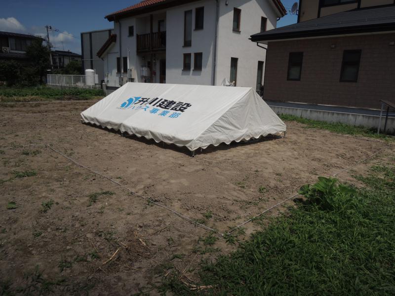 6月30日の地鎮祭に向けて、建物の位置出し、地鎮祭のテントの準備をおこないました。