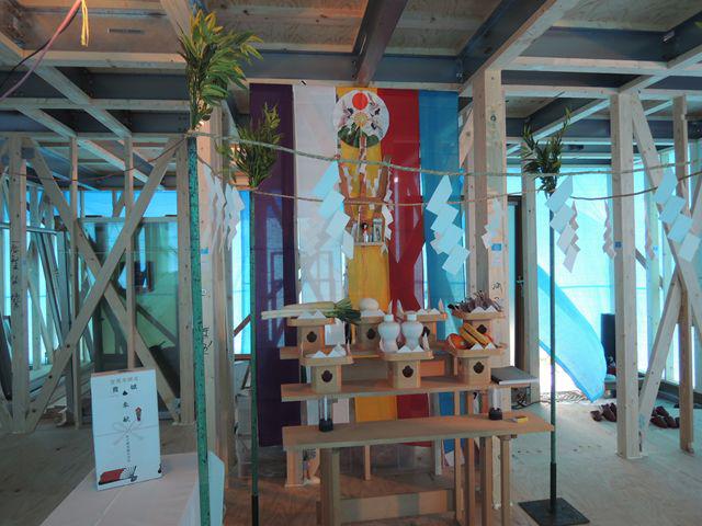 村岡工務店 棟梁の差配で神事をすすめて頂きました。いつものように玉串奉奠、上棟の儀をおこない、最後に工事の無事完成を祈念し乾杯で無事終了となりました。
