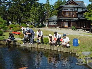 ▼上杉神社の池でEM浄化活動始まりました。