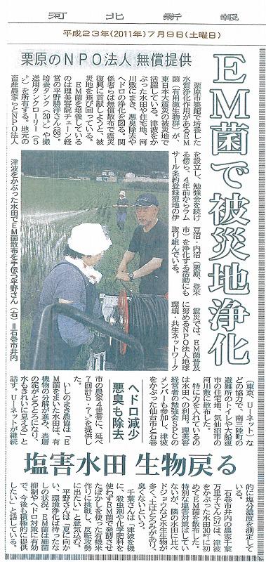 まだ中間段階であるが、EMを活用することによって、水田が浄化され臭気もなくなり、ヘドロは分解され、地力となり、同時に水田の生態系が甦っている。EMを活用していない、他の水田も、これまで、私が主張してきたように、「日本は雨が多く、梅雨で自然に除塩されるため、すぐに田植えすべき」という当方の提案の正しさを裏付けるものである。要は、EMを使ってない水田は、臭気が十分にとれていないため、秋落ち(土壌中にメタンや硫化水素等の有害物質が発生し、秋に入ると生育が急激に落ち込む現象)となる心配がある。今からでも10a当り、EM活性液を50L〜100L程度追加すれば、この問題も容易に解決することが可能であり、8月中に施用できれば並年作は可能である。