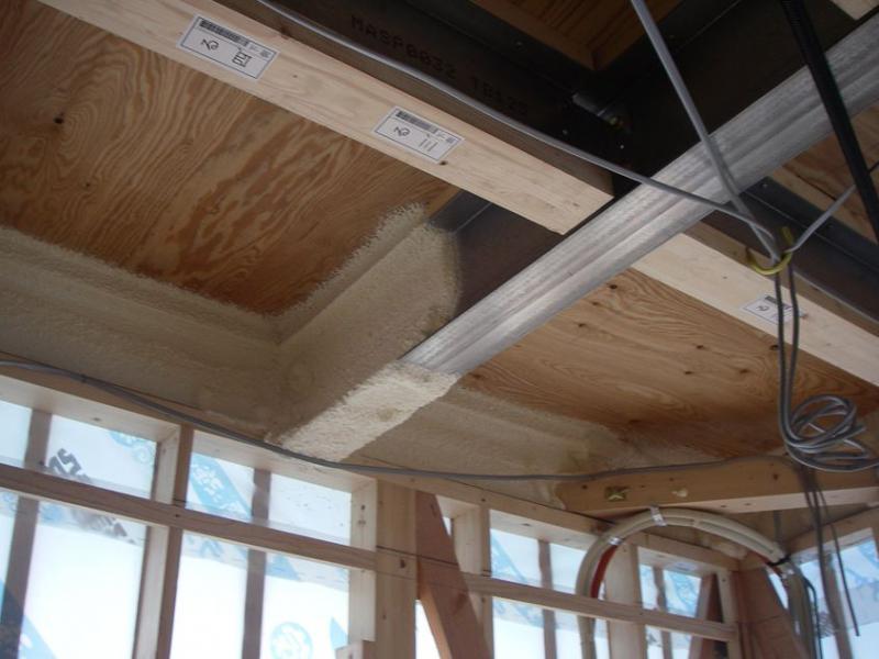 内部の断熱工事に先立ち、『テクノストラクチャー』を現場発泡にて断熱処理をしました。