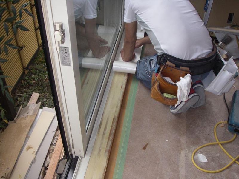 その上に、粘着剤付き化粧フィルムシートを施工していきます。