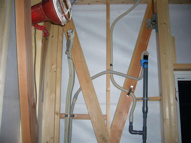 断熱工事の前に外部廻りの配線・配管がすすめられています。