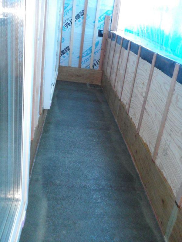 2階に上がってみるとバルコニーでFRP防水の下塗りの匂いでした。