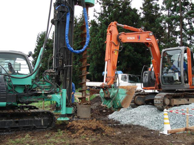 地盤改良工事が始まりました!砕石パイル工法を採用しています。
