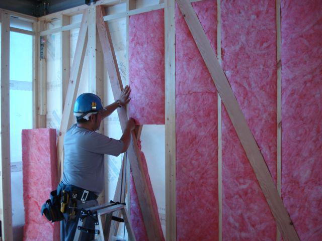 2階内部では、高性能グラスウールの断熱材を充填しているところです。
