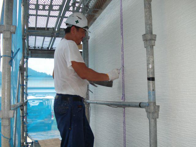 外壁材は、ますかわホーム標準仕様の親水セラを使用しています。張り付けが完了しシーリング施工をしているところです。