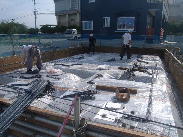外周の型枠建て・土間シート敷きが完了し、本日は鉄筋工事です
