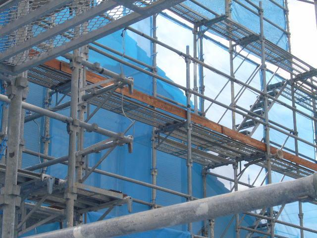 本日は、お隣さんのある東面足場のメッシュシート張りと、足場の内側の巾木施工です!