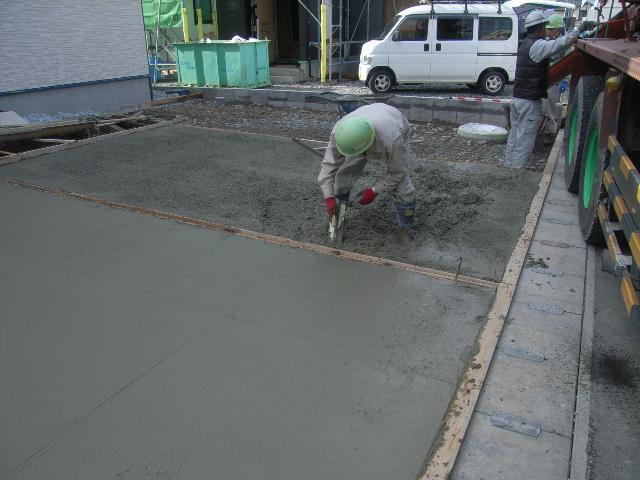 やっと晴れの日が来ました。ここでコンクリートを打設しなければ…と本日は駐車場のコンクリート舗装です!生コンやさんも本日は大忙しとのことでした。