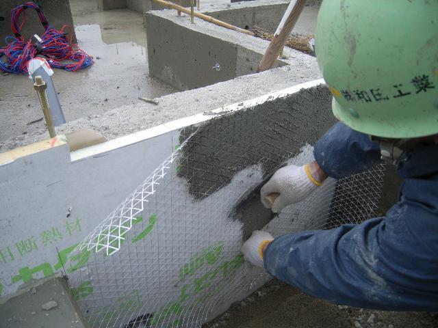 内外部の基礎型枠を脱型し、基礎外断熱部分にはネットを貼り、カチオンを混合したモルタルで断熱材を保護してから埋め戻しをおこなっております。