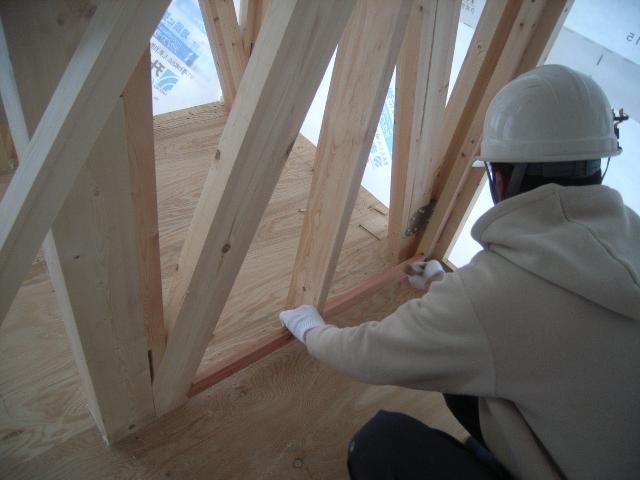 上棟検査も無事終わり、大工さんはボードの受け材を取付けております。