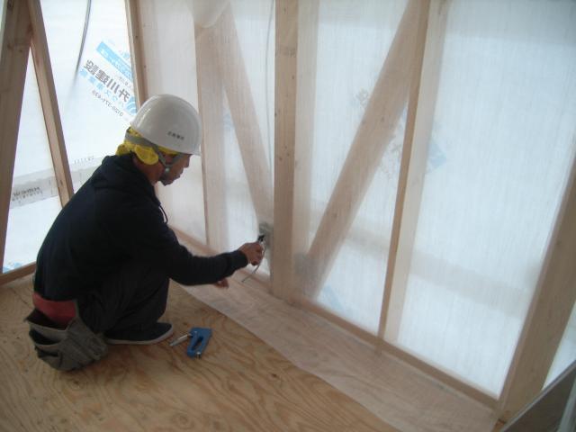 当現場の壁断熱は、グラスウールのBIB工法を採用しております。