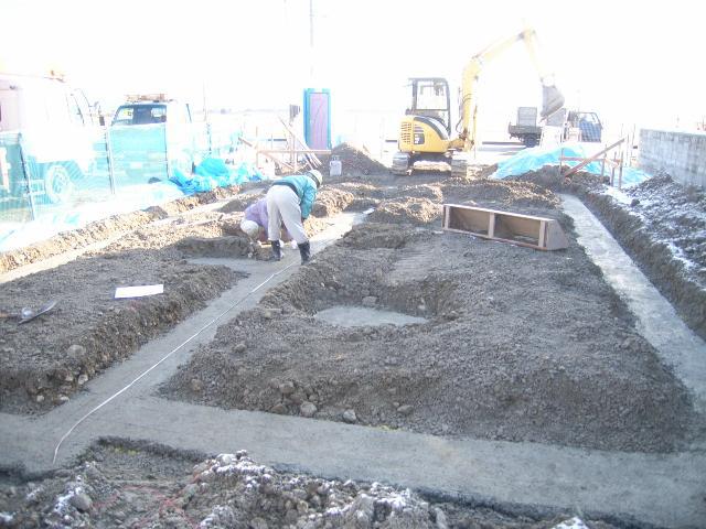 昨日打設した捨てコンクリートの上に角度を出す機械(トランシット)で正確な位置を出していきます。