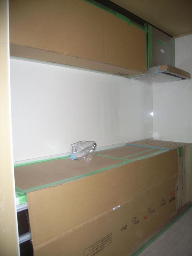 システムキッチン取付完了しておりました。ダンボール養生の為、よくみえませんが・・・・