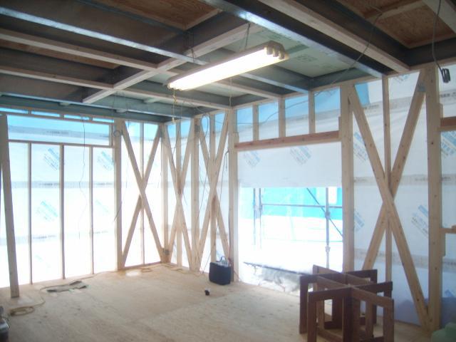 2階の床梁には、壁内結露防止のため、ロックウール系の断熱材『ロクセラムボード』を充填してから、透湿防水シートを貼っていきます。