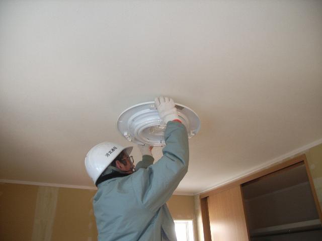 天井クロスの貼り終わったところから照明器具の取付けが始まっておりました。