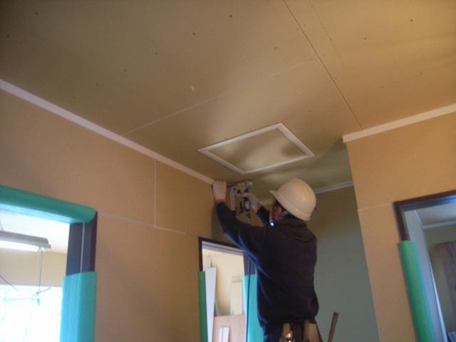 その大工さんは(銀歯のないまま)2階で廻り縁・巾木取付けを行っております。