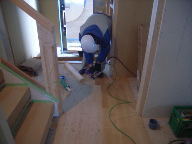1階 床無垢のフローリング貼りはリビングが終わり、廊下に差しかかっております。