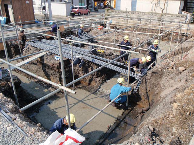 ガレージの根切り工事も終わり、いよいよ鉄筋工事が始まりました。