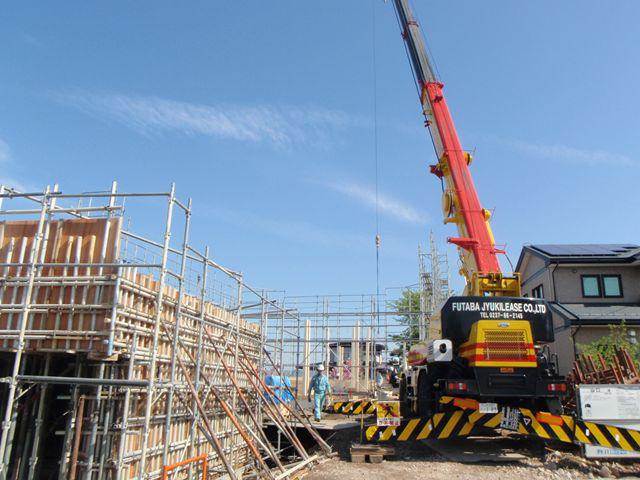 順調に作業進んでます。建物が大きいので明日も引き続き1階建て方です。