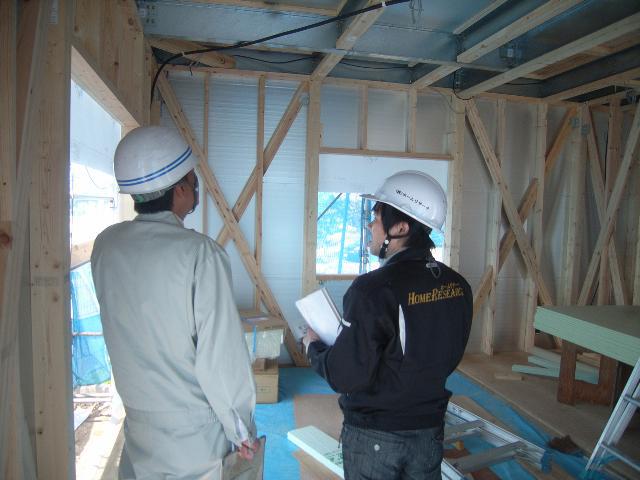 まずは、『ハウスジーメン』・『ホームリサーチ』の上棟検査(構造の検査)の状況です。金物を含め、柱・筋交い等、構造に関する部分を隅々まで検査していただきました。