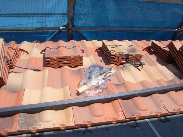 下屋部分の瓦葺きの状況です。暑い中での作業で大変です・・・