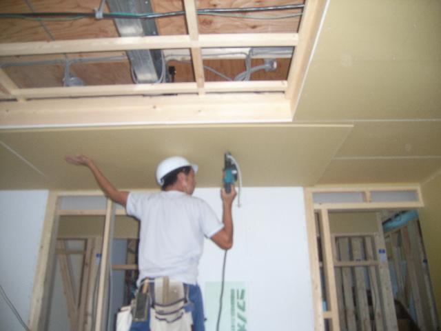 1階の天井は省令準耐火構造のため厚さ9.5oの石膏ボードを2枚貼りしなければなりません。