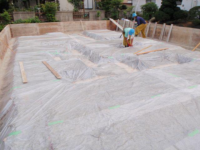 土工事もいよいよ終わりに近ずき 土間コンクリート下の防湿フィルム張りしております。