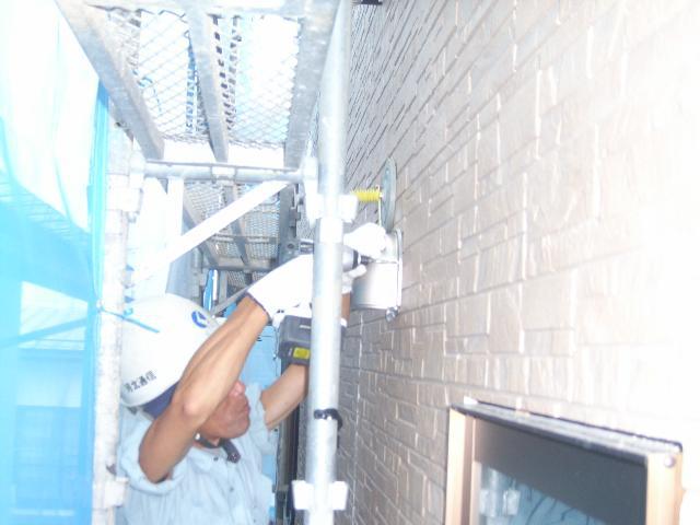外壁にコーキング材がつかない様に、紙テープで養生をしてから打ち込み開始です。