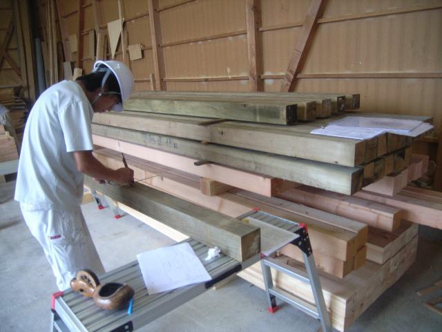 事前加工開始です。建て方前に柱・土台等々加工図に合わせて加工します。