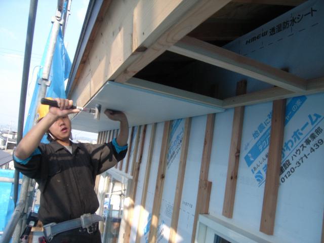 外部では軒天上げがもう少しです。省令準耐火構造の建物の為11oもあるセメント板を使用しております。