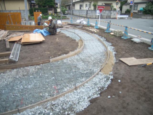 外構工事 アプローチの砕石下地・型枠組立が完了しました。