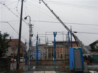 本日、あいにくの天気ですが建方作業開始しております。