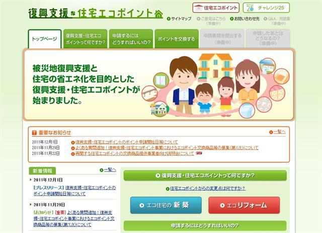 同制度については、事業者向けの説明会を12月6日から全国13カ所で開催するが、それに先立って、制度の内容を専用ホームページ「復興支援・住宅エコポイント」に掲載した。
