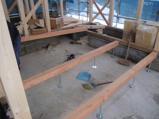 ただ今 1階の床下断熱材入れと28ミリの合板貼りをしております。