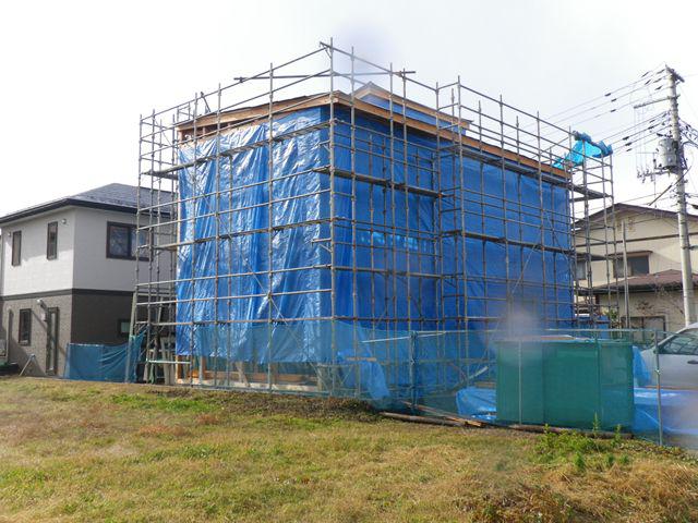 雨(雪)・風対策のブルーシートを外壁面に貼り、本格的な木工事スタート!です。