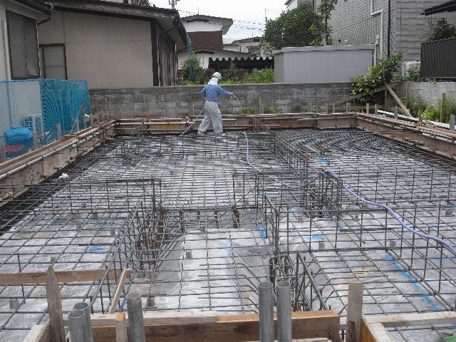 夏場なので、コンクリートが急激に乾かない様に、型枠を水で濡らしてからコンクリート打設を開始します。