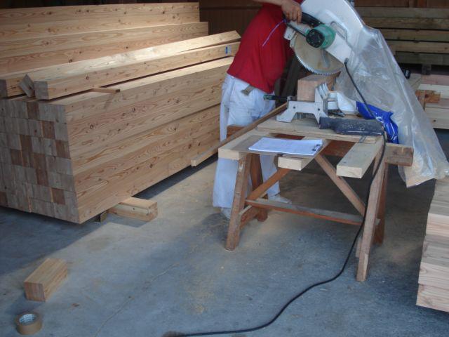 お盆明けの作業は、材木店加工場にて大工さんが木材加工に取り掛かっています。